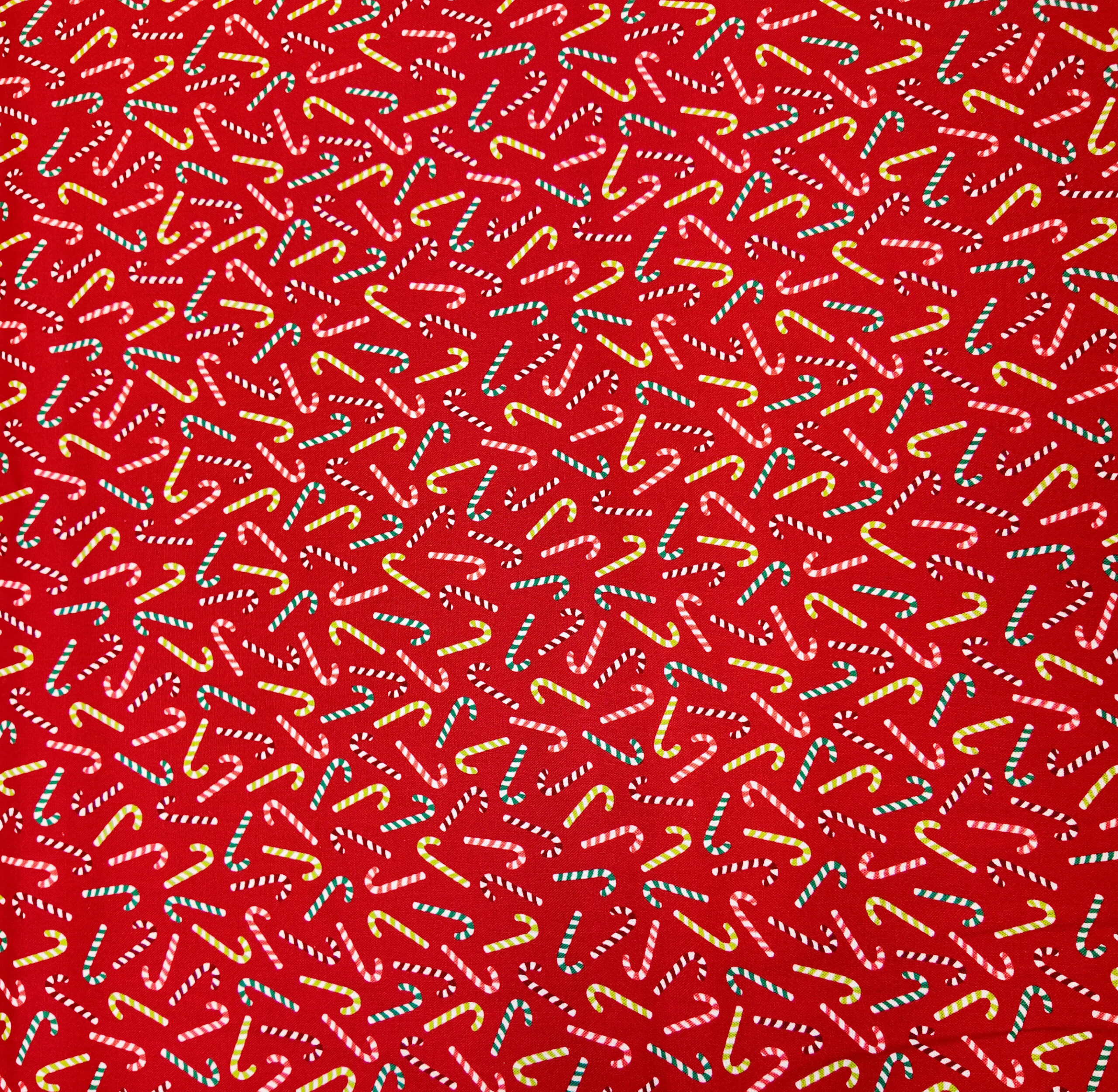 Des cannes à sucre colorées dansent sur un rouge éclatant. Ce tissu respire la gaieté des fêtes et la douceur sucrée des traditions de Noël.