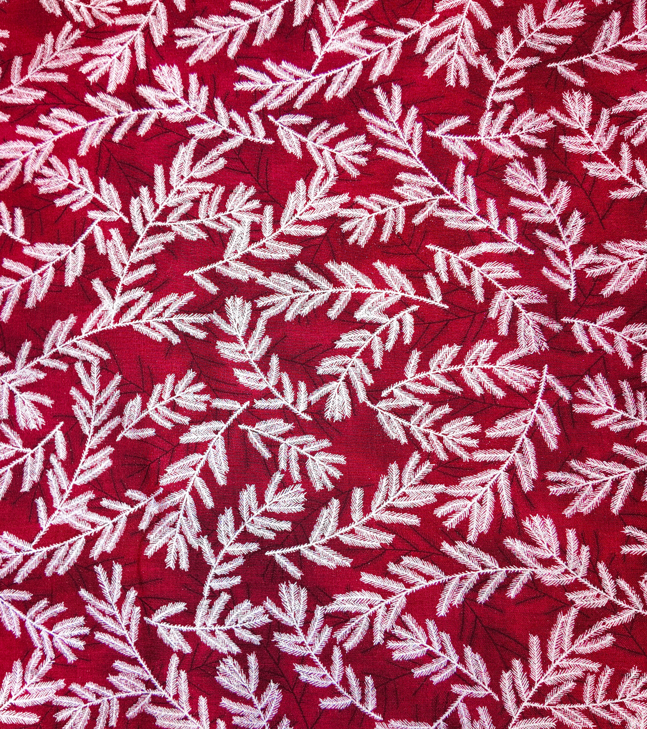 Des branches givrées blanches s’étendent sur un fond rouge profond. Ce tissu inspire la fraîcheur d’un matin de décembre, entre givre et feu de cheminée.