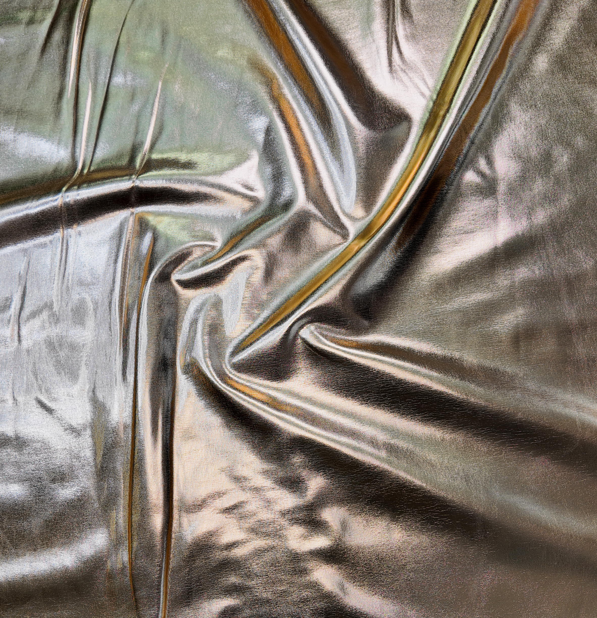 un métal souple aux reflets champagne se plie en vagues satinées, capturant la lumière dans une lueur chaleureuse et changeante.
