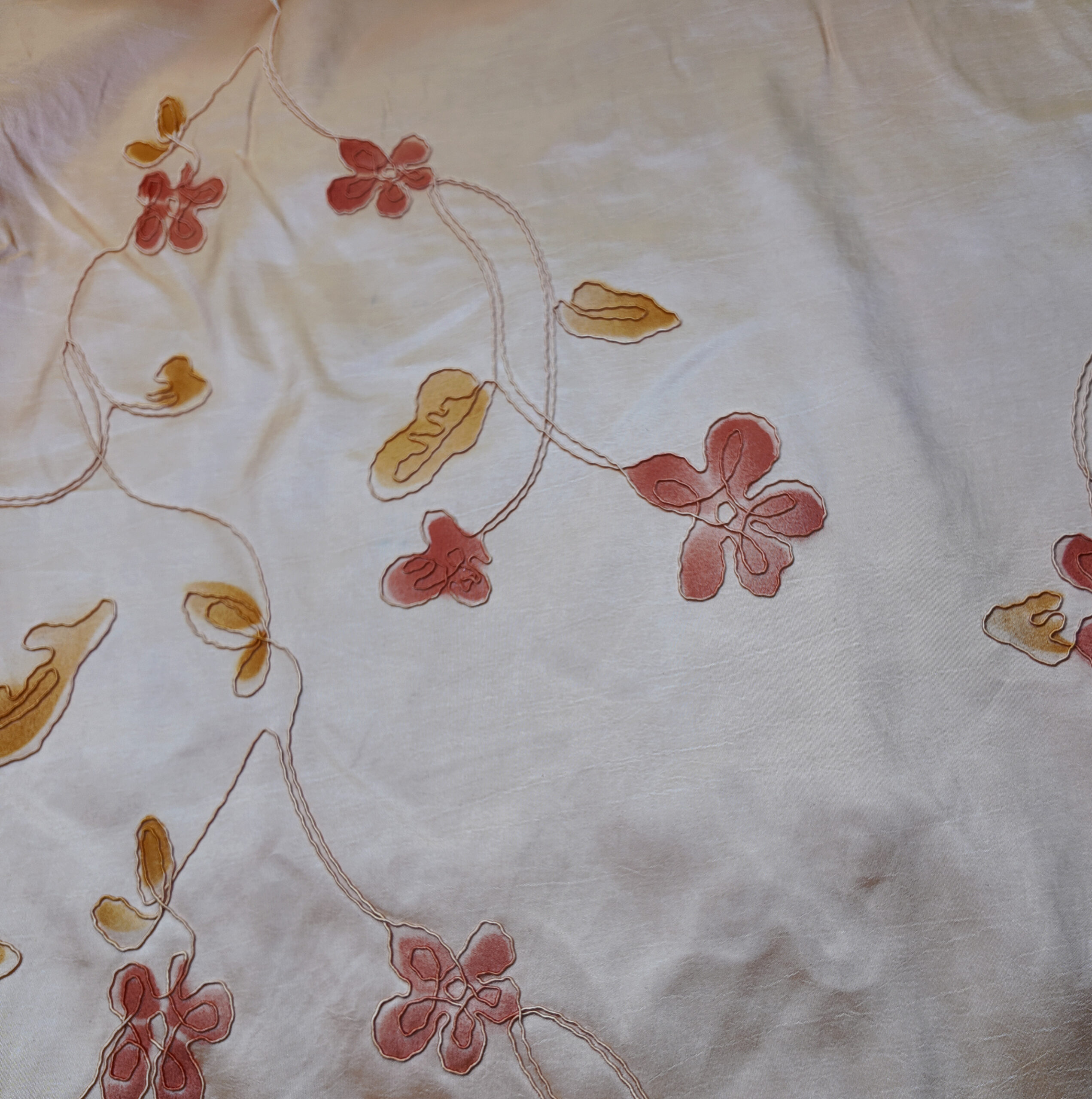 un ton crème accueille des fleurs rouges et dorées, délicatement posées sur des lignes souples qui évoquent un jardin lumineux et chaleureux.