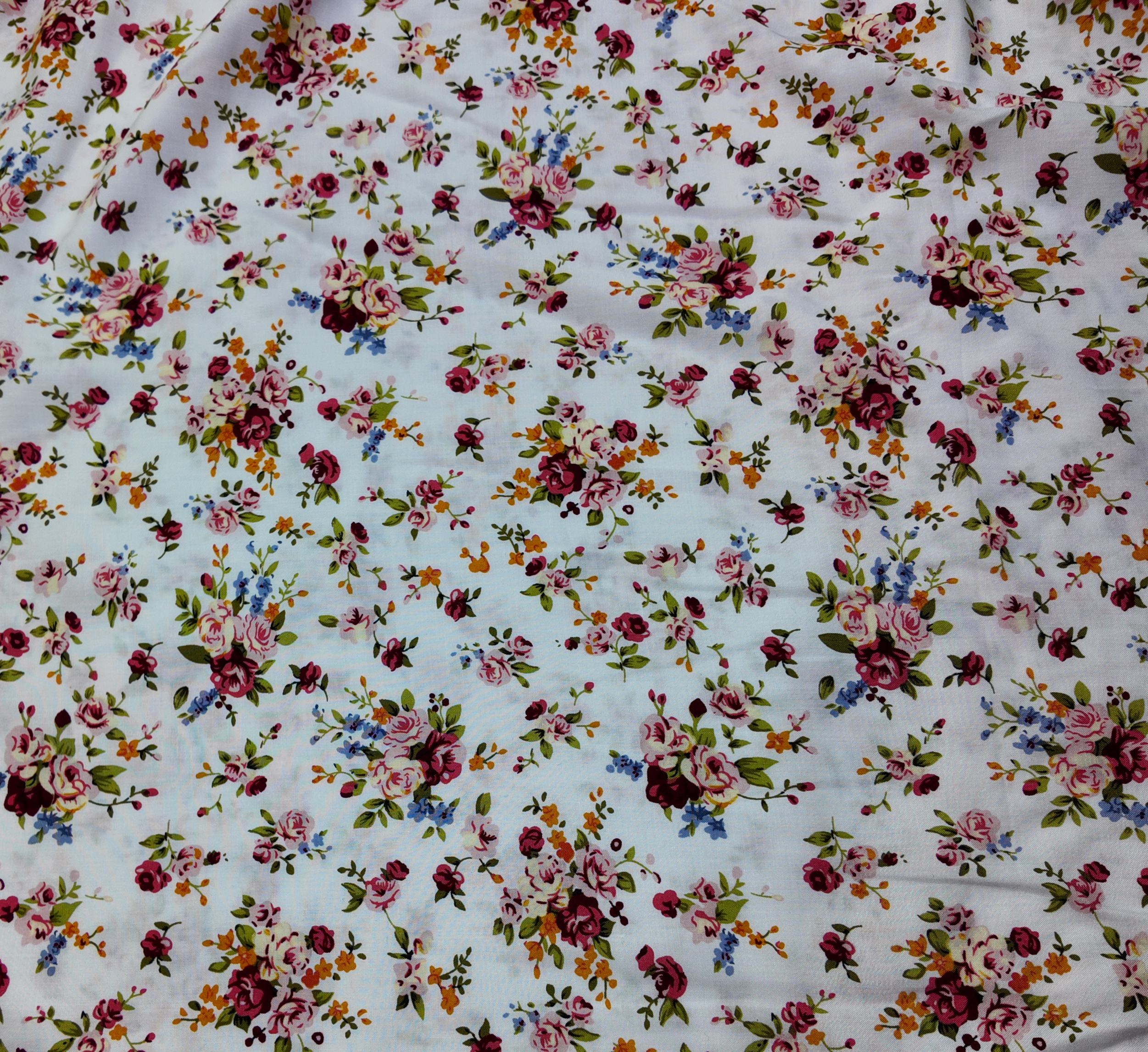 Tissu de viscose. bouquets roses et rouges mêlés à des touches bleues et orangées, éclatant sur un fond clair comme des compositions florales fraîchement cueillies